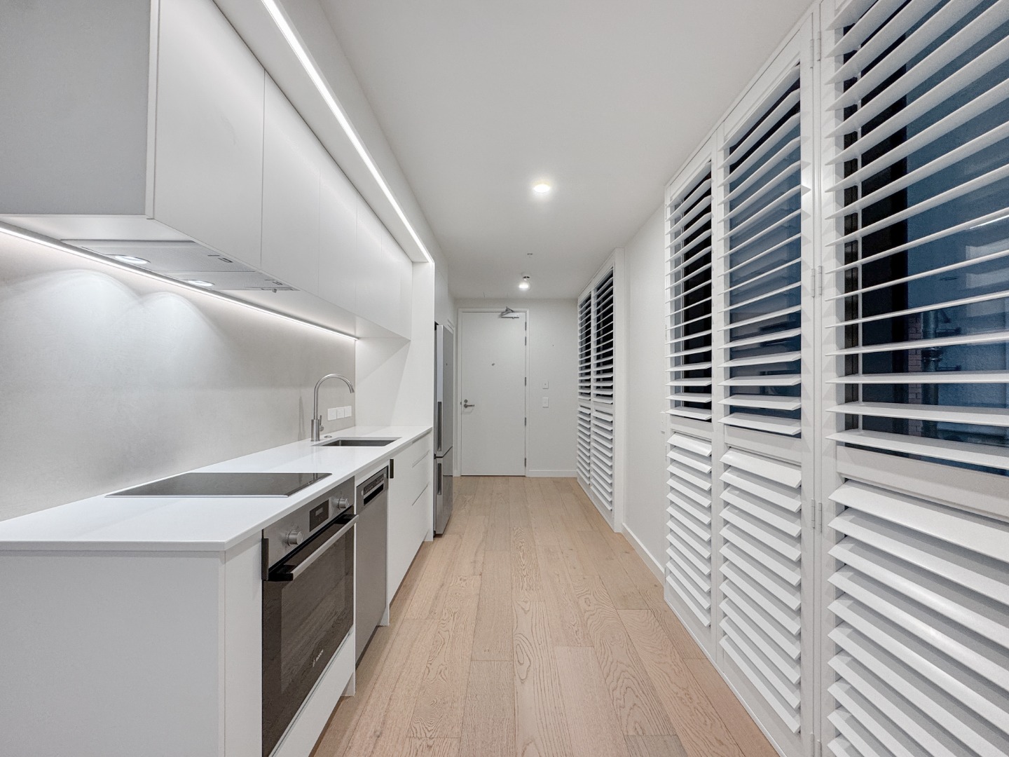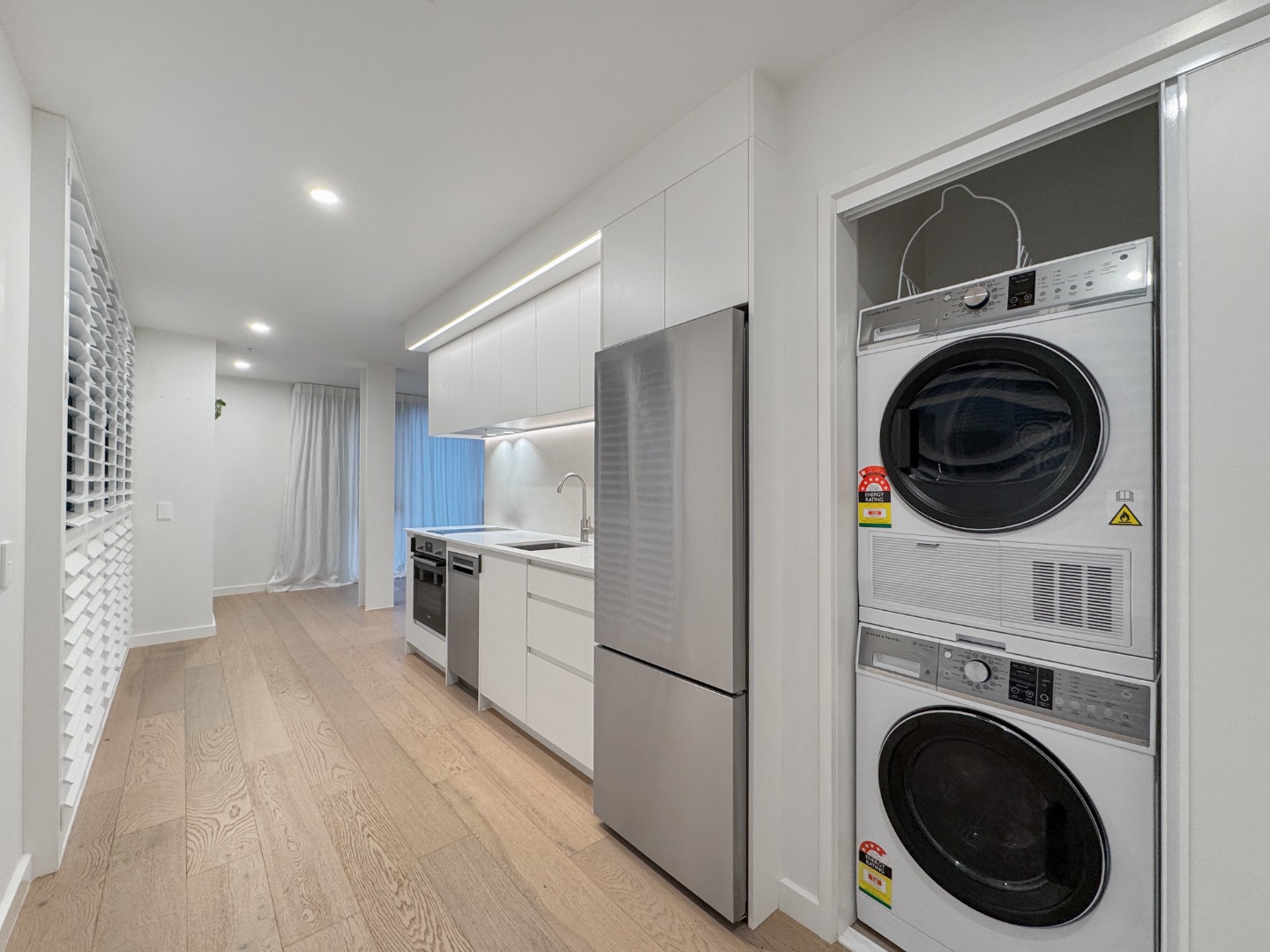 The sleek galley-style kitchen is well appointed with quality appliances, streamlined cabinetry, and integrated lighting, flowing seamlessly into the living space. A standout feature is the separate laundry cupboard with stacked washer and dryer, cleverly concealed for convenience and efficiency.