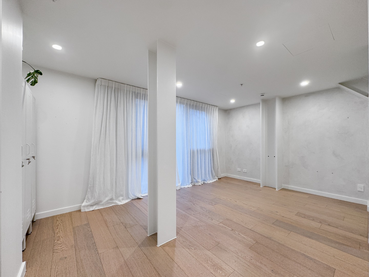 The home features a spacious open‑plan living and dining area with engineered timber flooring, recessed lighting, and excellent natural light. Floor-to-ceiling glazing with sheer curtains creates a soft, contemporary feel, while the layout provides flexibility for both relaxing and entertaining.