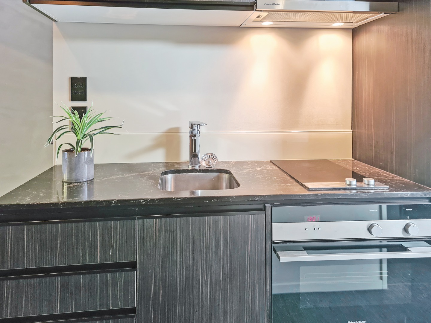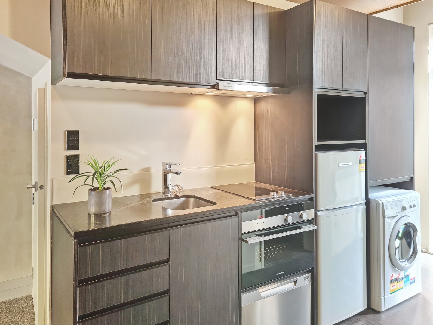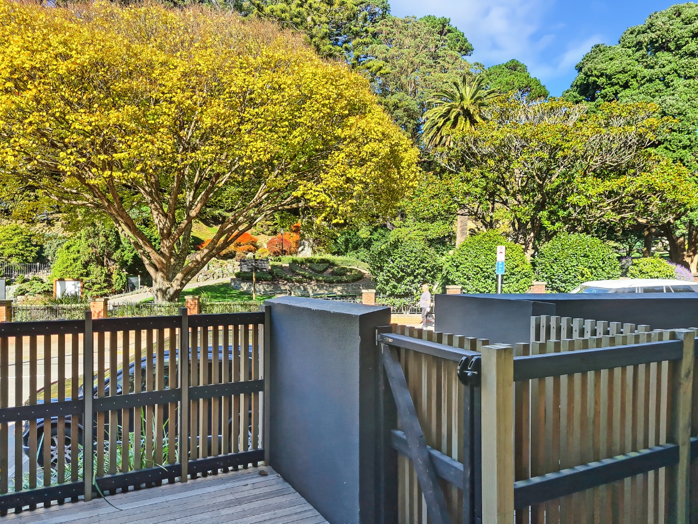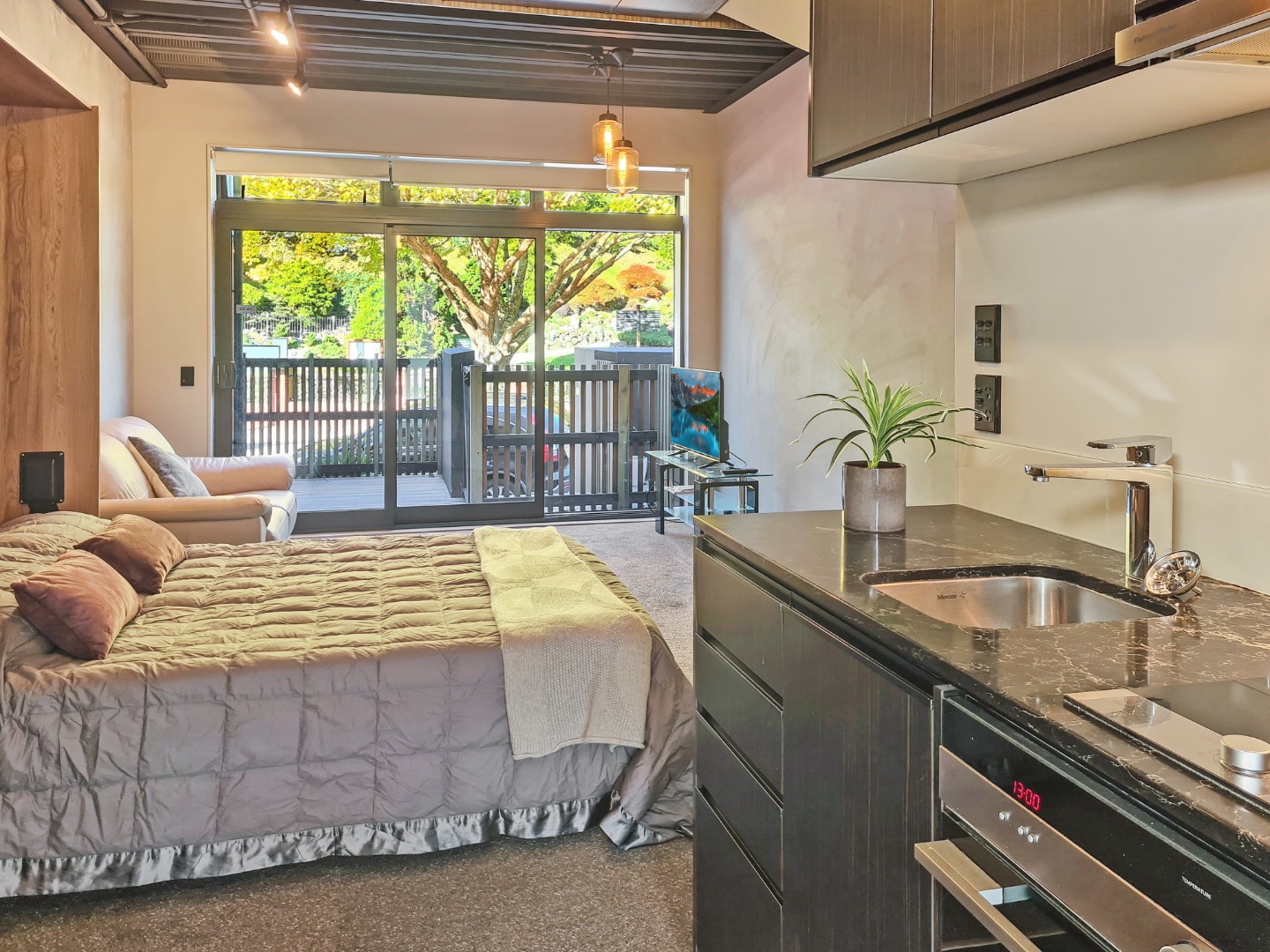 Spacious and private ground floor studio apartment with excellent flow to the large deck and overlooking the Wellington Botanical Gardens. This apartment is well designed to ensure the best of apartment living – this includes features such as a queen-sized drop down bed system allowing for space maximisation, large windows to allow for natural light, self-contained kitchen and laundry.