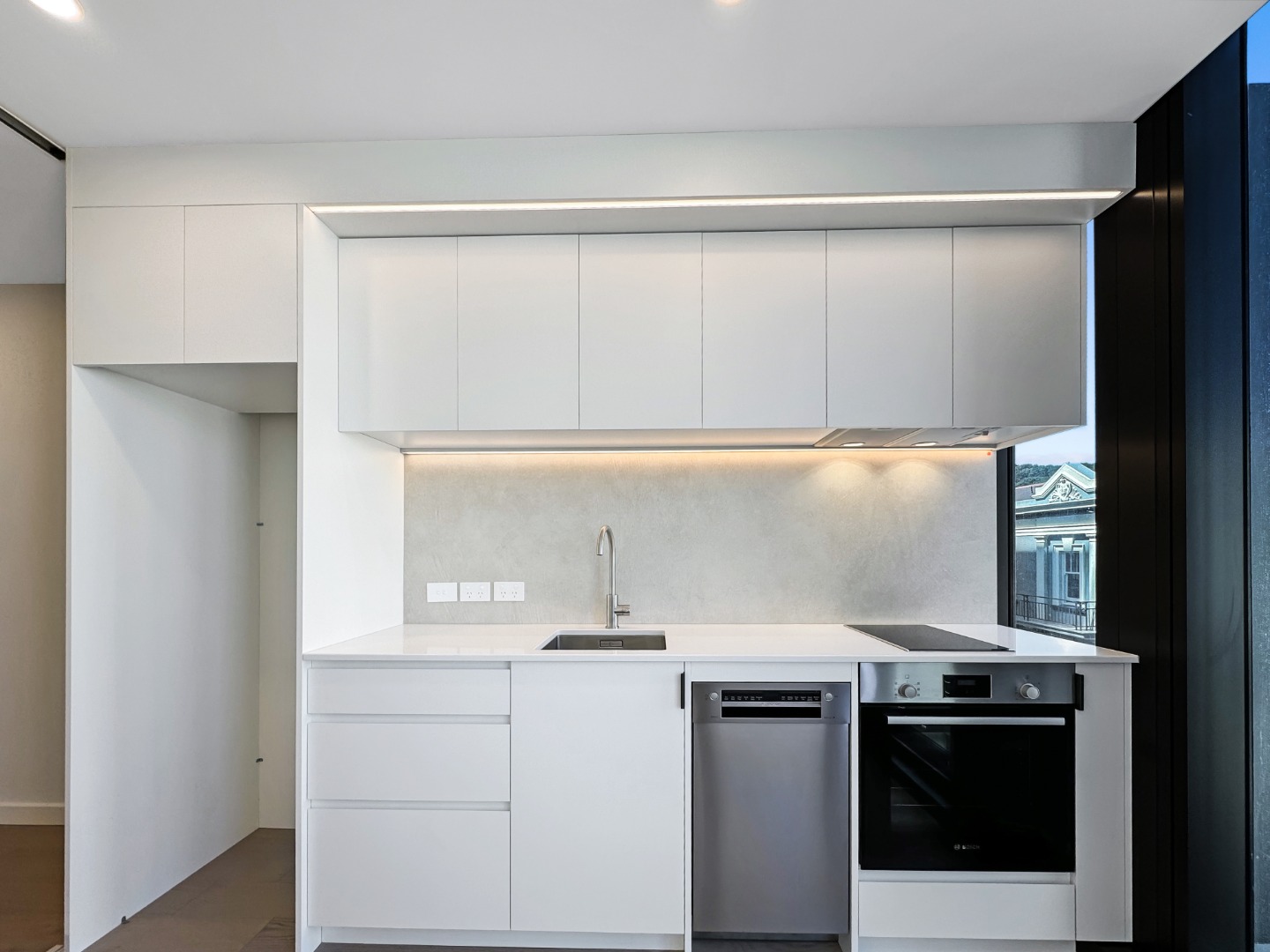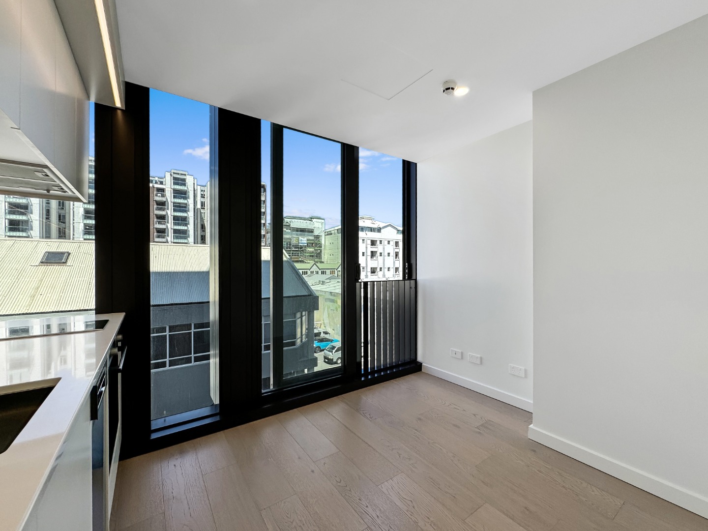 – Open plan living area with large full height windows overlooking Alpha Street