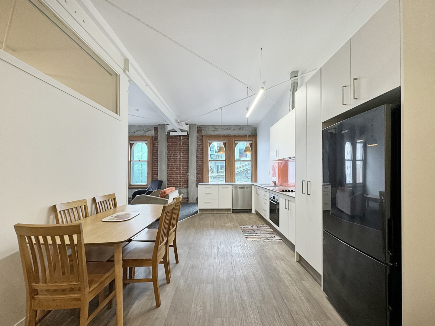 Positioned on the top floor of the character James Smith Corner building, the apartment has a super sunny westerly aspect. Upon entering the apartment, you are greeted by the large open plan living area bathed in natural light through the native timber sash windows. The modern kitchen features quality appliances, plenty of bench space and storage and a breakfast bar.