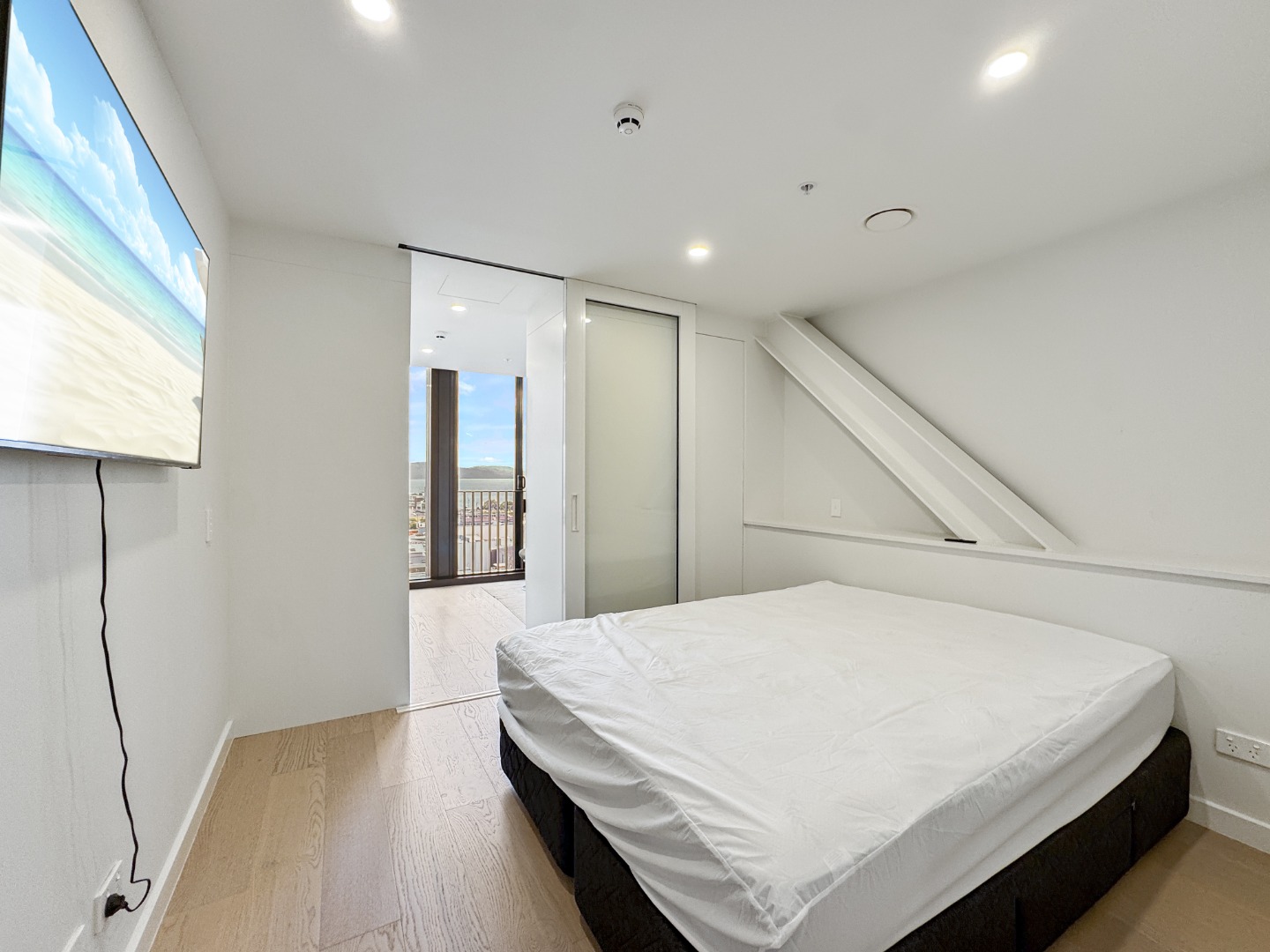 – Comfortable bedroom with built-in storage and sliding door for privacy