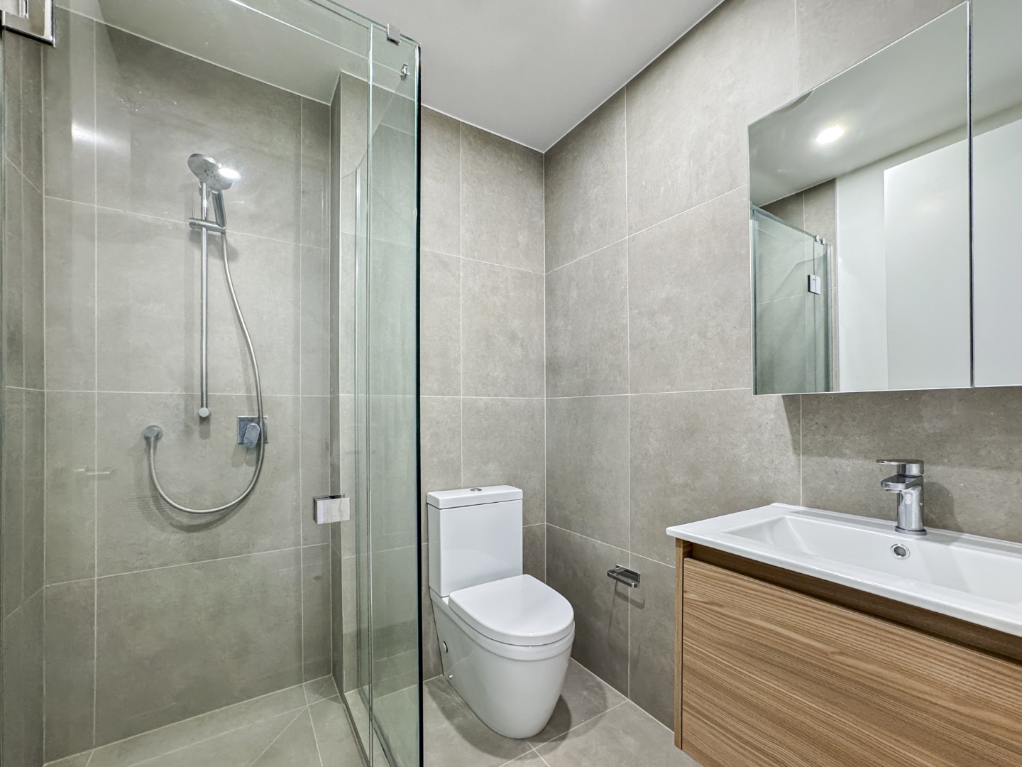 – Sleek bathroom with glass shower and quality finishes