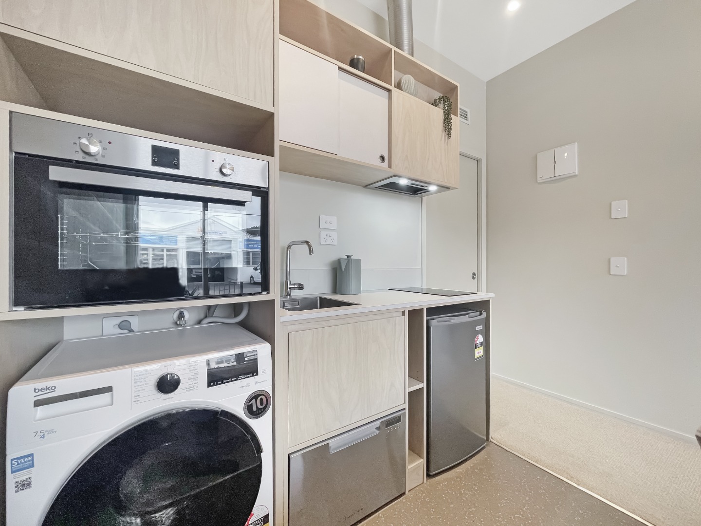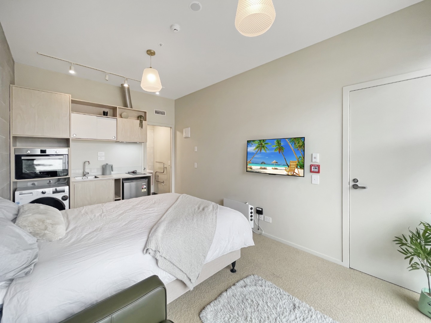 This stuido apartment is cleverly designed with the added convenience, the apartment comes furnished, including a leather couch, TV, queen bed, and essential whiteware — making it an easy move‑in option.